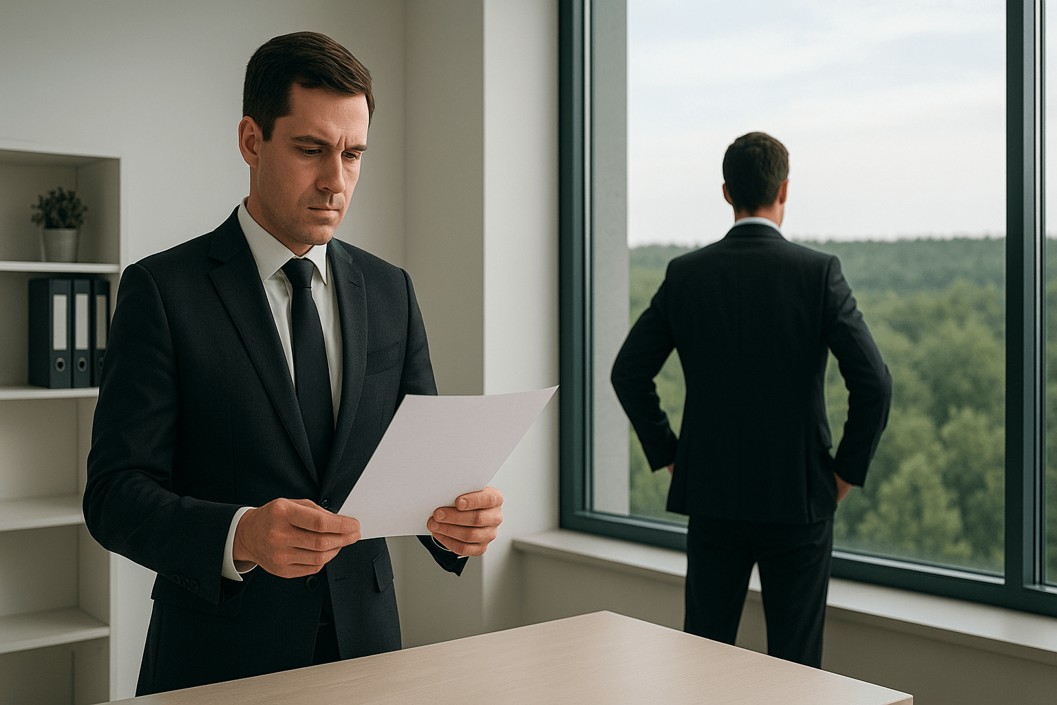 Esta versão transmite a mensagem com realismo e clareza. À esquerda, o empresário examina uma folha ? símbolo da técnica, do olhar limitado ao detalhe. À direita, outro observa o horizonte sobre uma vasta floresta ? representação da mentalidade empresarial, a visão ampla e estratégica. A dualidade visual reforça o contraste entre executar e liderar com propósito.